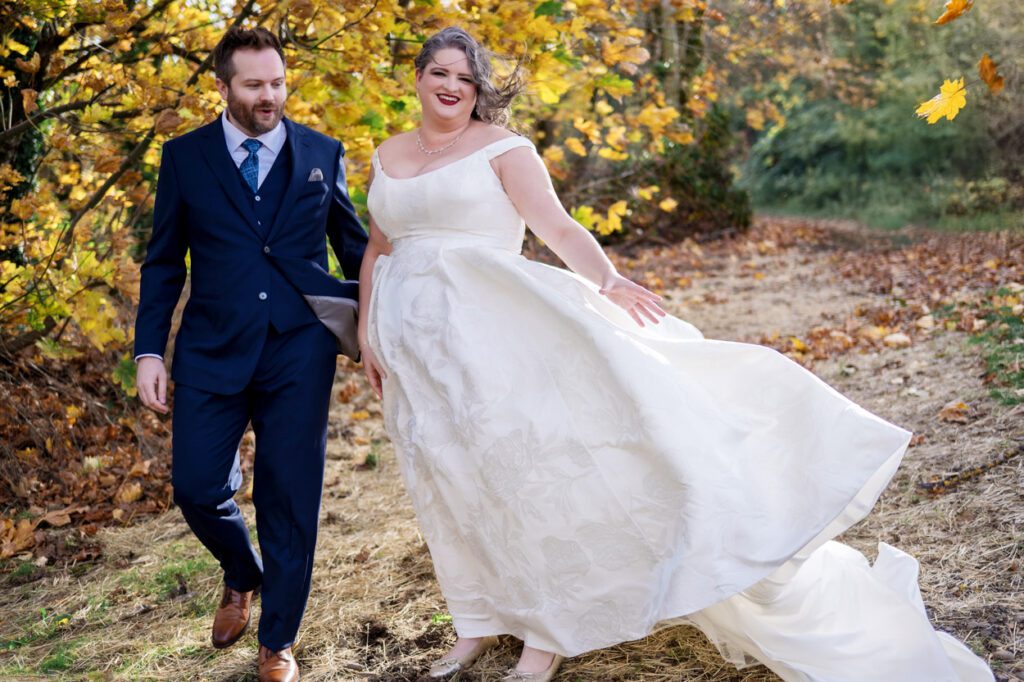 The couple shared their first look beneath a canopy of vibrant yellow autumn leaves. It was such a beautiful, emotional moment. Afterward, we made our way down to the newly opened riverfront area behind The Troutdale House. The city recently cleared out some trees, revealing a gorgeous view of the river, and they’re even adding a little riverside park and walkway soon. I love that this is now a new option for photos and can’t wait to visit again once it’s complete.