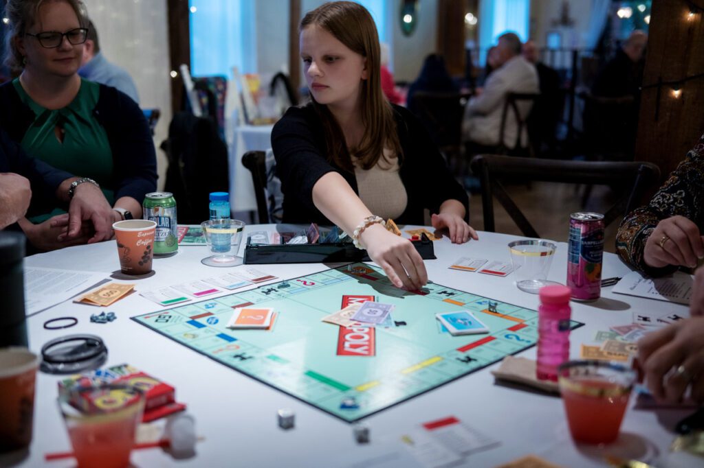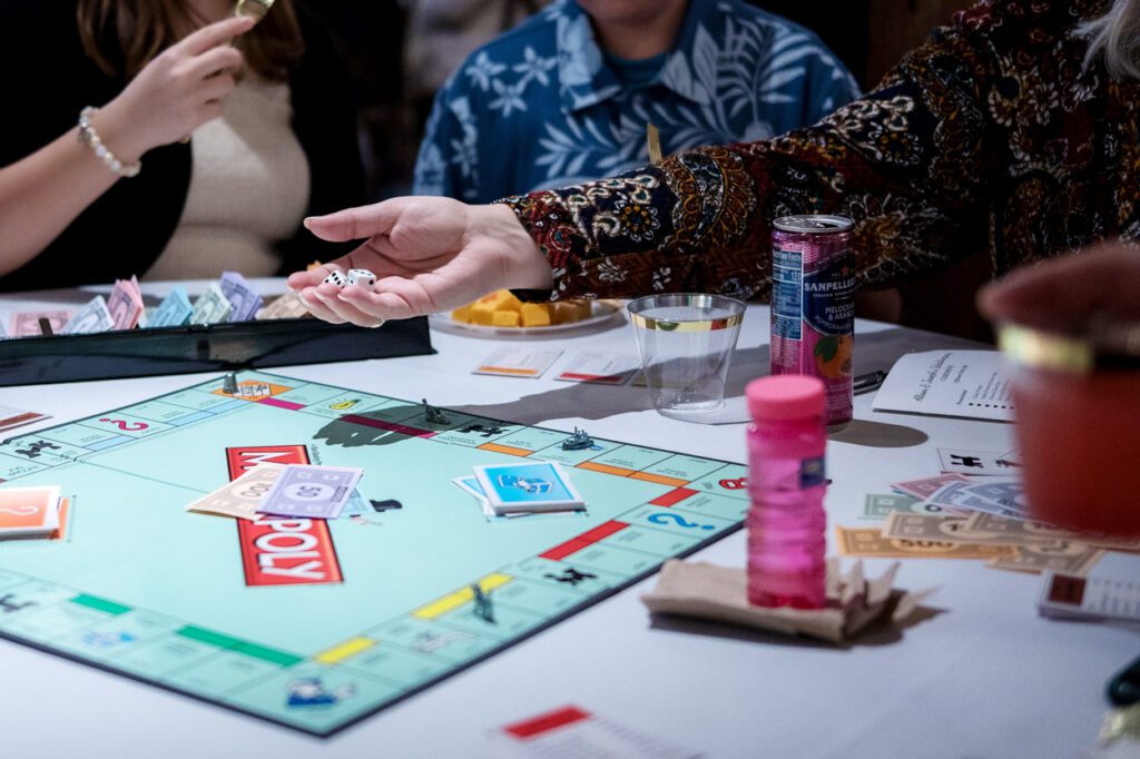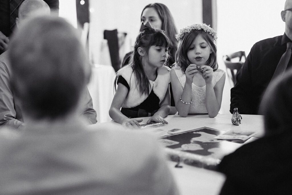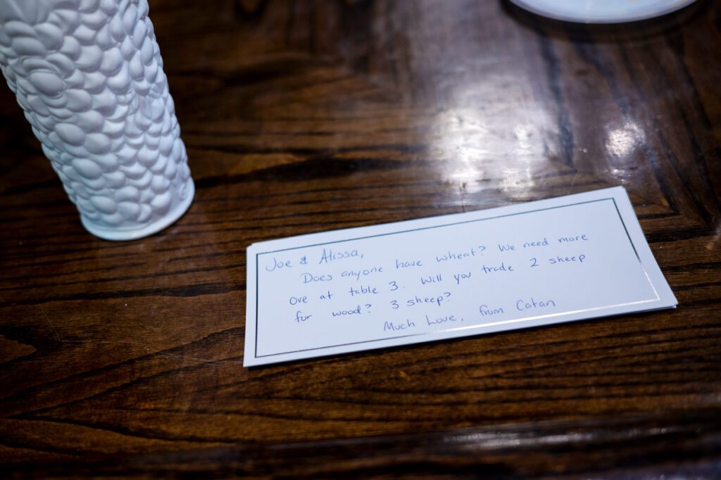 The reception that followed was intentionally relaxed and fun. Each table had a game to play, and guests were encouraged to record their winners on a chalkboard scoreboard. It made the whole evening feel playful and connected. Later on, the dance floor opened up for some lively moments, including the Macarena and a Cumbia dance to honor the bride’s mom’s family traditions.