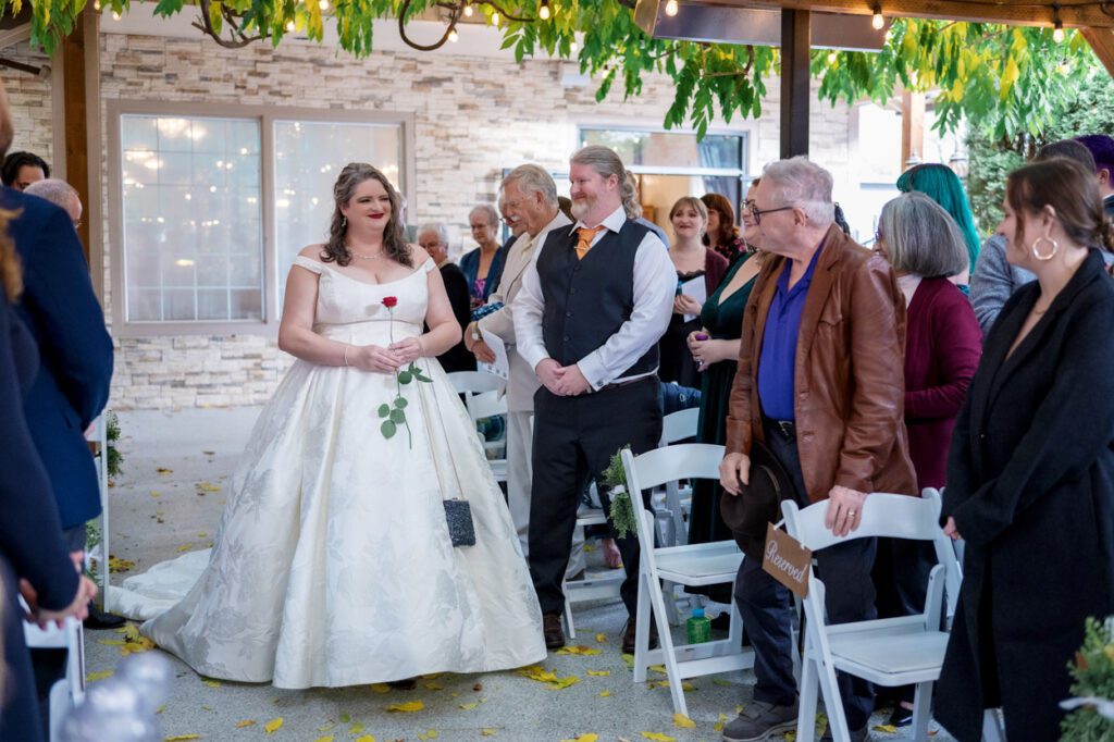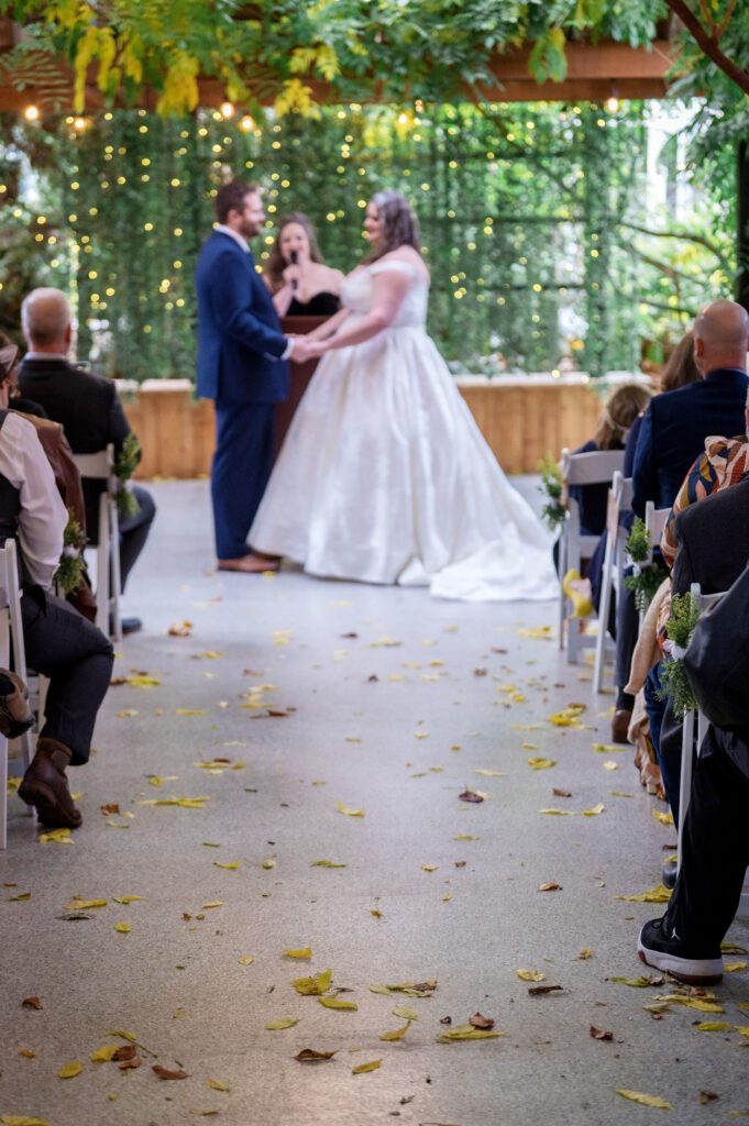 The ceremony took place in the Wisteria Garden, which looked extra charming with golden leaves scattered across the ground. The couple provided cozy blankets as guest favors, which everyone loved since it was a bit chilly that day.