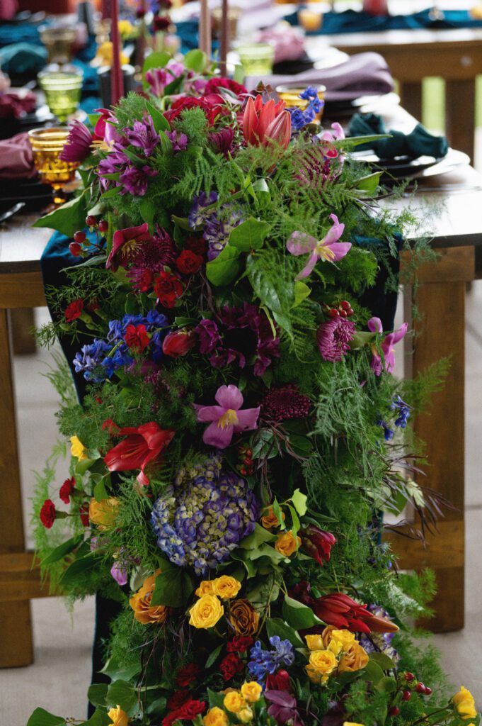Jeremi from Pollinate Flowers absolutely nailed the floral vision. He created a suspended ceremony installation that doubled as a focal point above the sweetheart table. He also added a floral cascade at the end of the reception table, with individual bud vases placed among the candles for a playful, romantic touch.