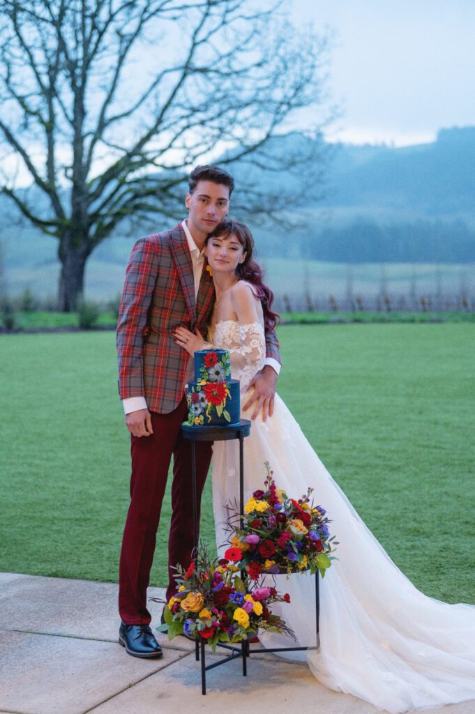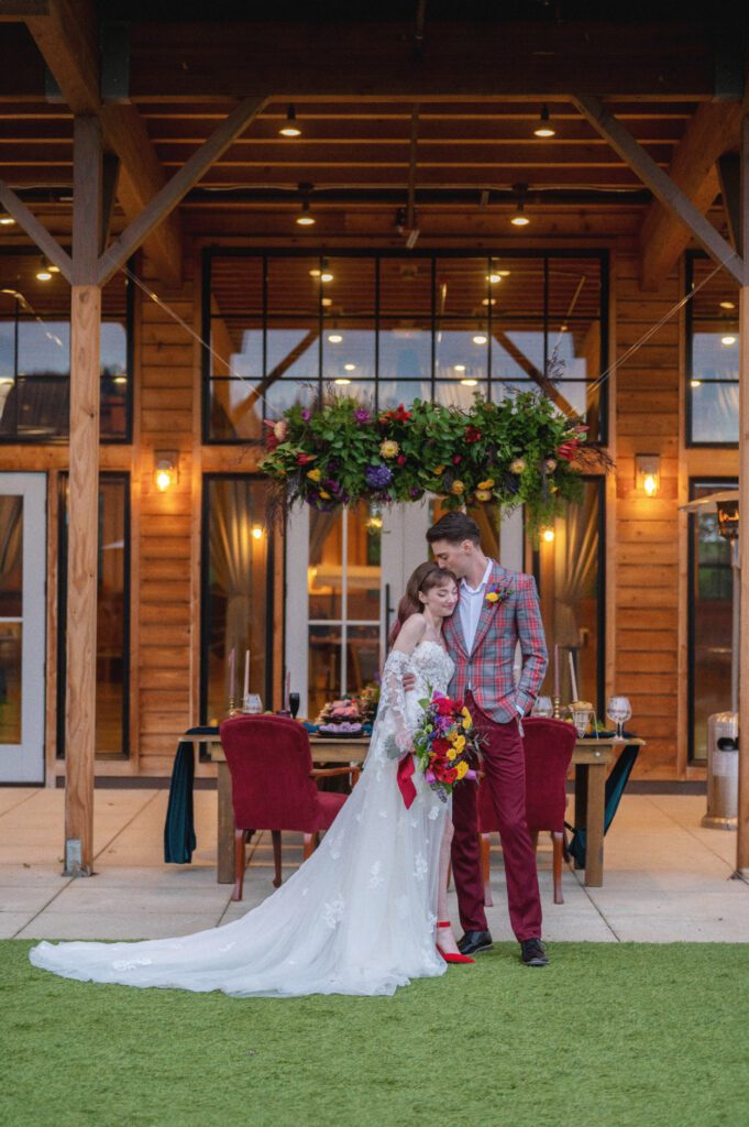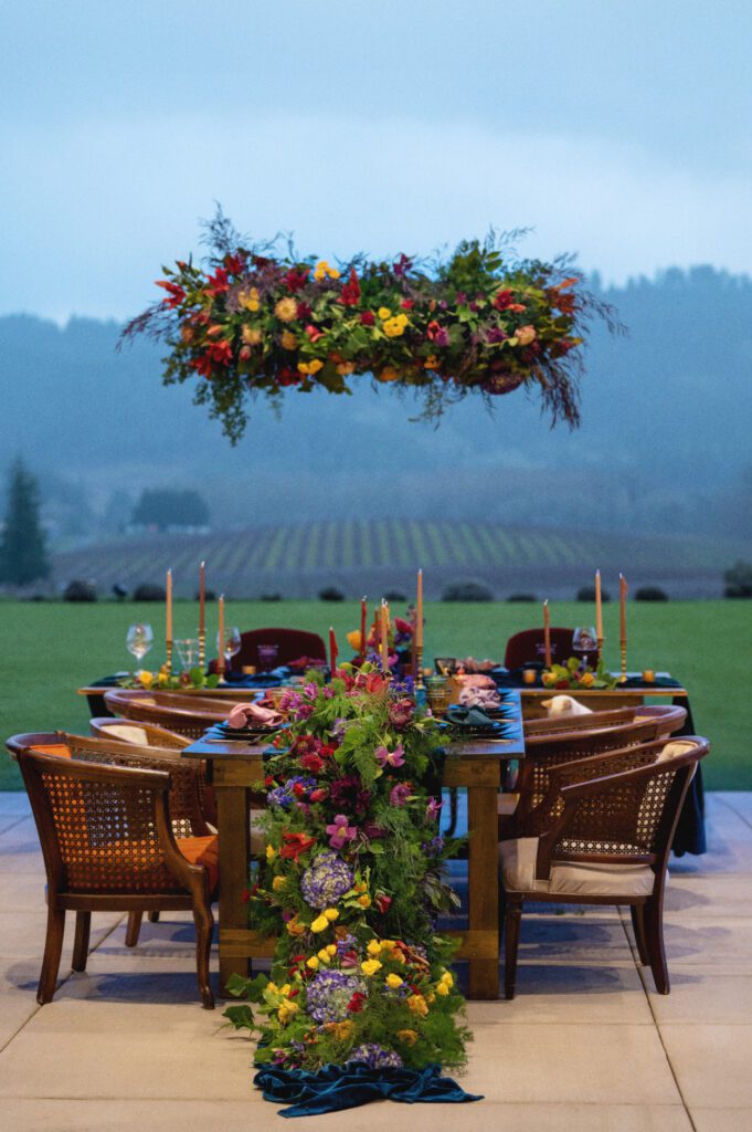 For this shoot, Elle from Elle Beauty & Events planned an intimate wedding setup that embraced the gorgeous view from the covered tasting room patio. Her vision brought in rich jewel tones and a warm, welcoming atmosphere that felt both elevated and relaxed. Even though the setting leans rustic, she created a look that felt refined, cozy, and timeless.